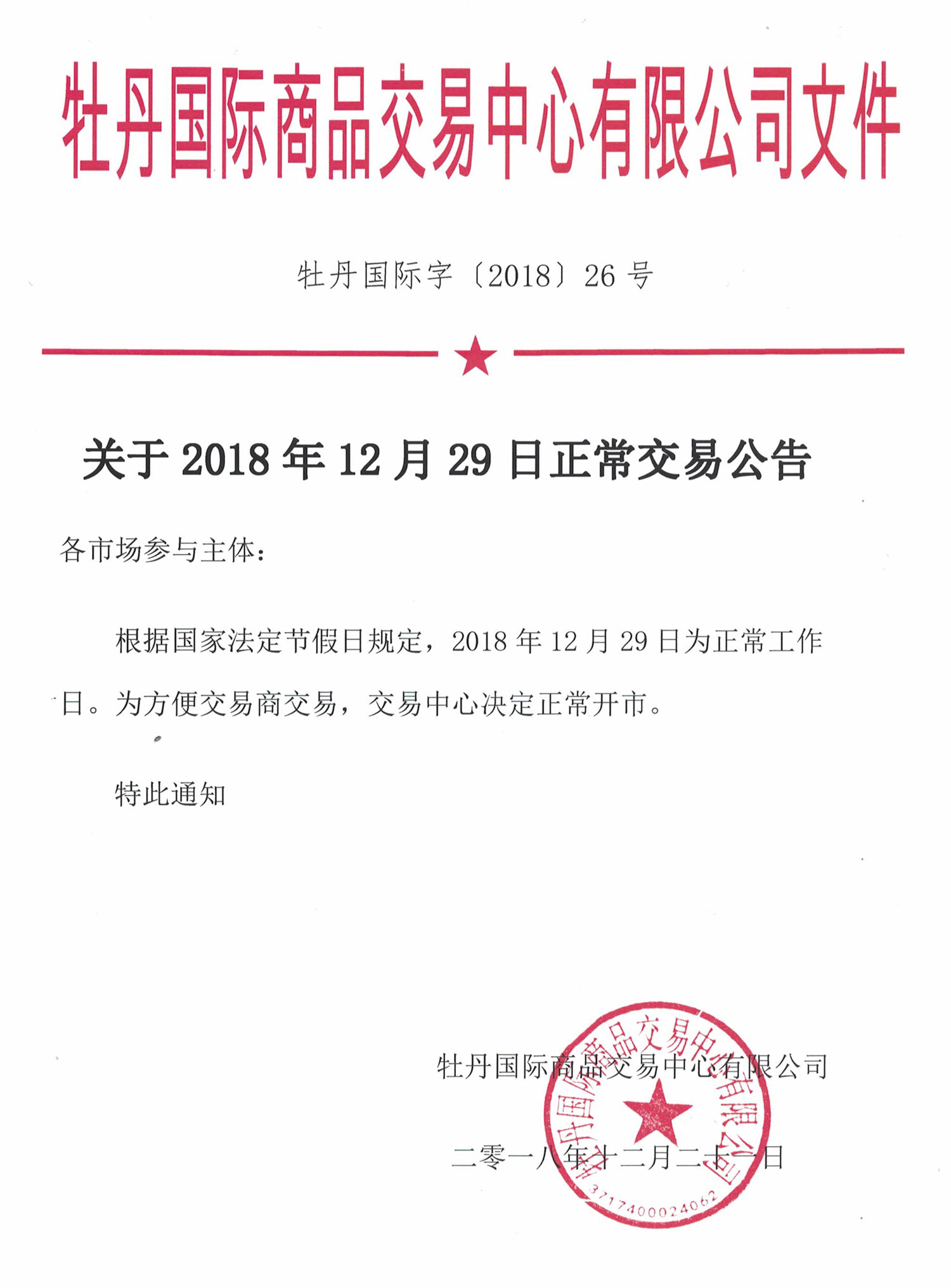 關(guān)于2018年12月29日正常交易公告