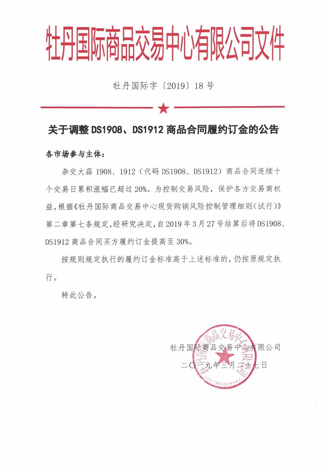 關于調(diào)整DS1908、DS1912商品合同履約訂金的公告